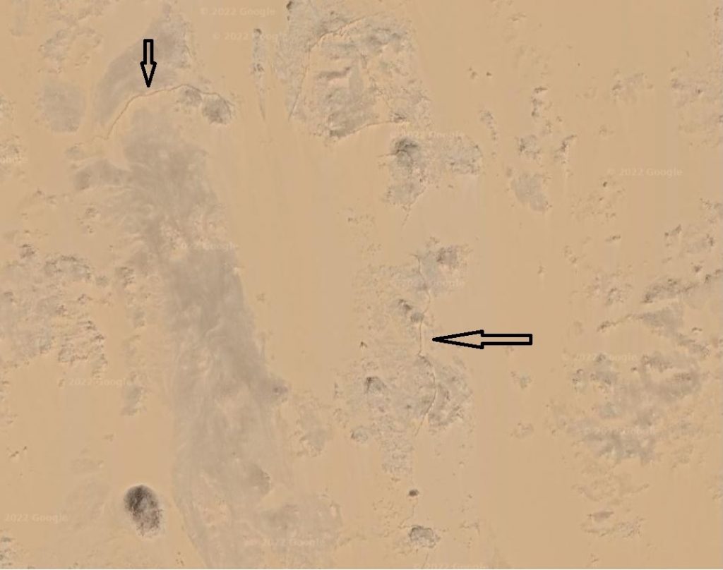 Finally, current satellite imagery is quite useful for understanding parts of the landscape that have not changed as radically. The Sahara might be drier and sandier nowadays, but there isn’t a reason to suspect that human activity has changed the location or heights of many of these desert cliffs or pathways. Sometimes, one can even identify archaeological features like game drives—low walls that most archaeologists think were used to herd and trap gazelles and other animals (Storemyr 2011). In other places, it is possible to see clear places where there was an ancient island or pathways/roads through fields (the technical term for these pathways are “hollow ways”).