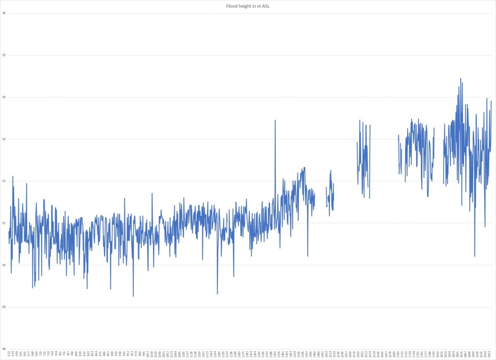 The key point here is that we can relate the measurements in cubits at Roda to absolute measurements from 1871 onwards. Following Seidlmayer, we can use a simple linear regression to construct a best-fit line to correlate cubit measurements from Roda to an absolute value in meters above sea level. In our case, this equation is as follows: The reconstructed height at Aswan (A)= (the Roda measurement (R)+95.75)/1.240388 or A=(R+95.75)/1.240388.  This proved extremely accurate from 1871-1958 save in cases of exceptionally high floods. From this, we could derive a recalculated estimate of maximum flood heights from 622-1958! You can see a plot of this variation included in the chart below.