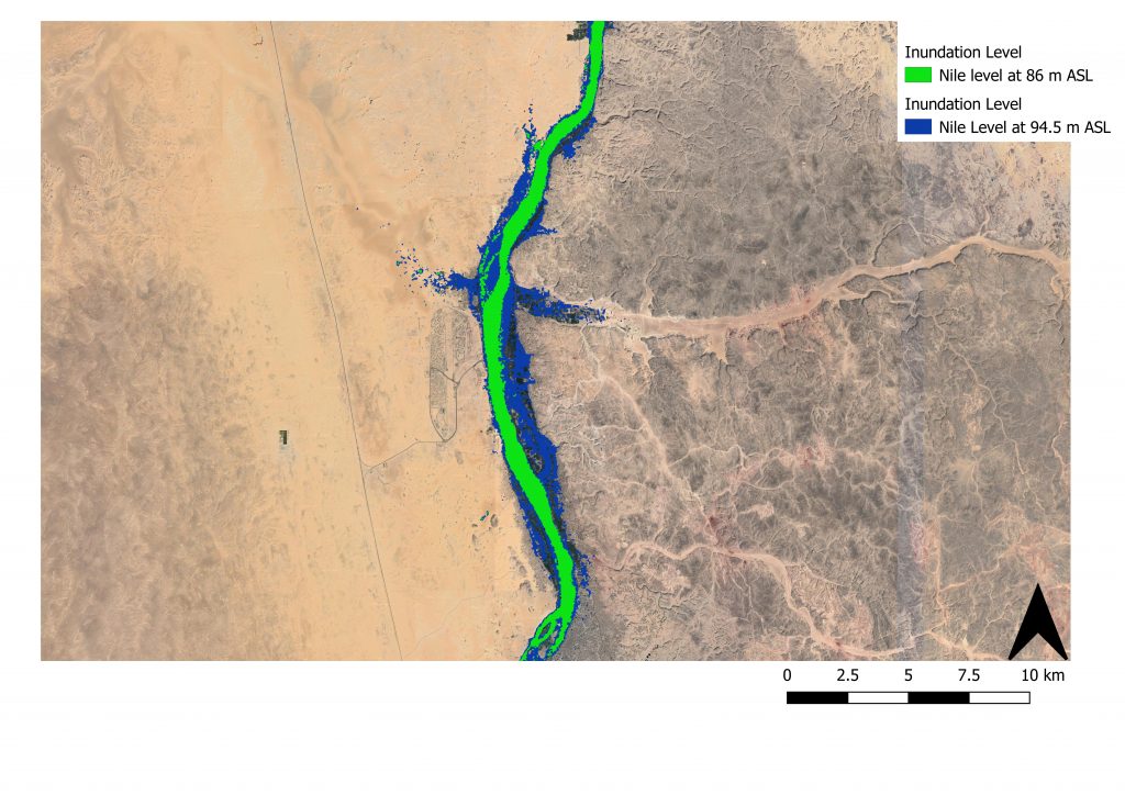 The ability to represent this data visually depends on having access to a Digital Elevation Model, an important element of spatial analysis that we previously discussed. In our case, we used freely available LandSAT/SRTM data. As you’ll recall, each pixel within this DEM is assigned an elevation value. Using tools within QGIS, it is a fairly simple process to create a new raster from this data that colors in every square below a height of, say, 94 m ASL. This shows the areas within the modern landscape that would be flooded by an inundation reaching this height. Using similar calculations, we can estimate the Nile’s low water level at roughly 86 m. Check out the results below!