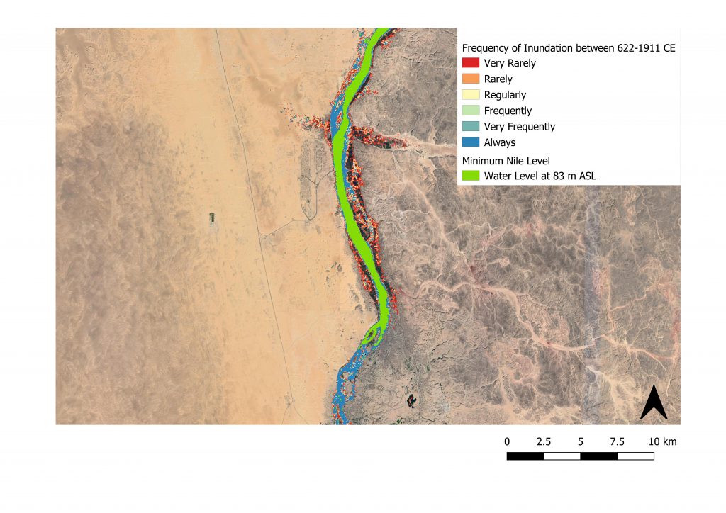 Incorporating the mass of nilometer readings we discussed above is slightly more challenging but led to equally intriguing results.  We were very fortunate to find a QGIS plug-in designed by Ukki Kaden to model how frequently different areas of a floodplain were inundated using data from water gauges. Because neither Maria nor myself are expert coders, she was kind enough to help us better understand how to input our data into a plug-in designed for daily water readings. Nonetheless, we were able to use this excellent plug-in to model our flood data from 622-1911 CE. You can see the results below!