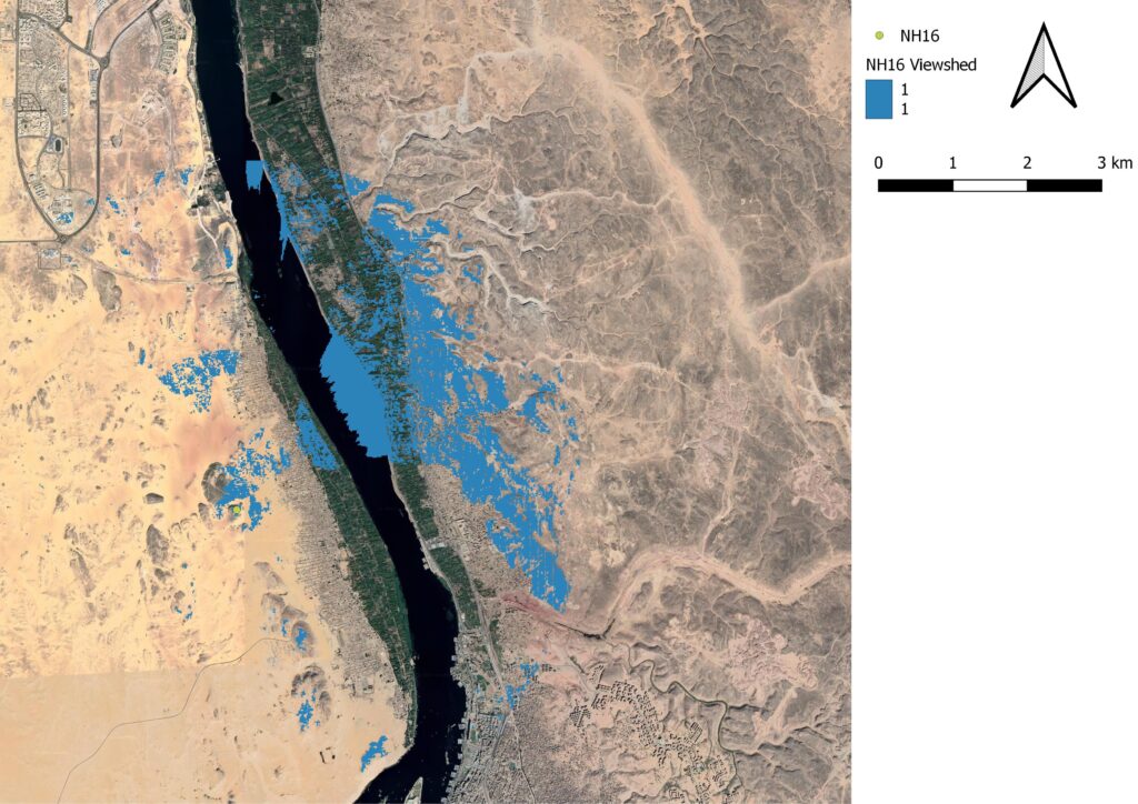 During our time working at NH16, it was impossible not to notice its strategic position atop a local cliffside—not least because we made the trek up from the wadi bottom every morning! Using viewshed tools in QGIS helps to give us a bird’s eye visualization of NH16’s place in the landscape.  Using the TanDEM-X imagery that was graciously provided to us by the DLR, we have been able to produce fairly accurate viewsheds for each site we worked at this past season together with a number of areas previously excavated by the Aswan-Kom Ombo Archaeological Project.